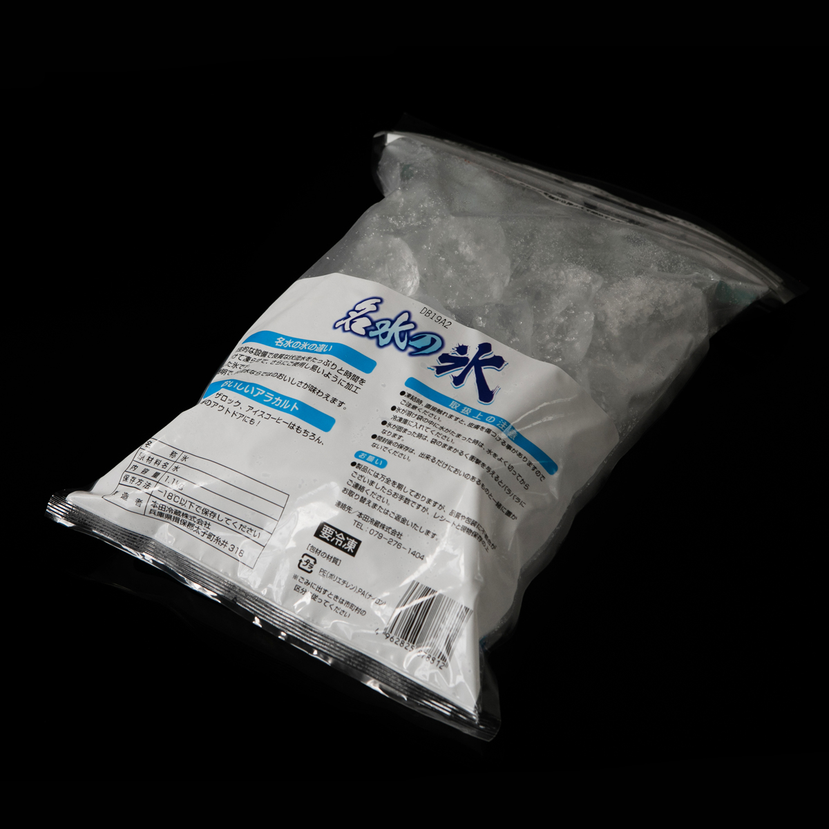 長い年月をかけて大自然に磨かれた播磨の名水として名高い揖保川の伏流水を使った氷。 保存に便利なWチャック付。